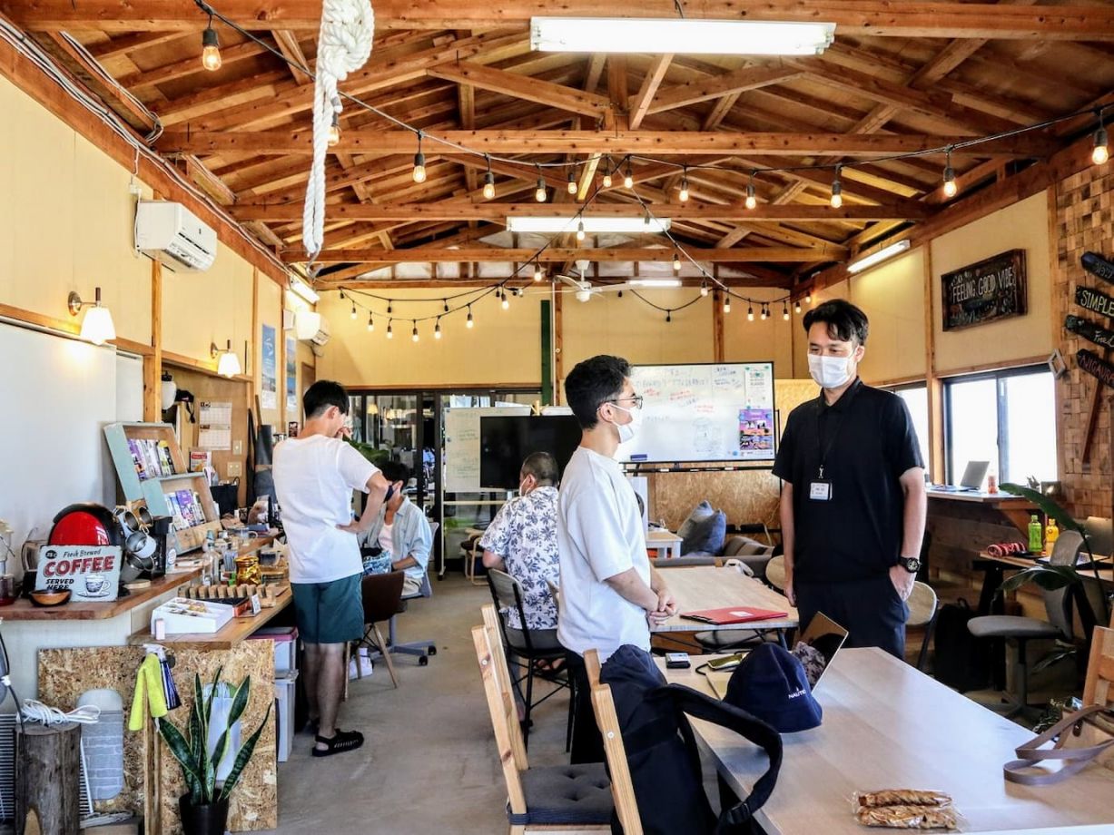 移住体験プログラムの滞在拠点となるのは、“人があつまり、人と人を編んでいく場所にしたい” という想いを込めたゲストハウス『編湊(あみなと)』。網屋だった築50年以上の空き家をほぼ自分たちの手で改装して創られた『編湊』には、コワーキング利用もできる飲食スペースや宴会スペースのほかに、海が見える屋上もあります。