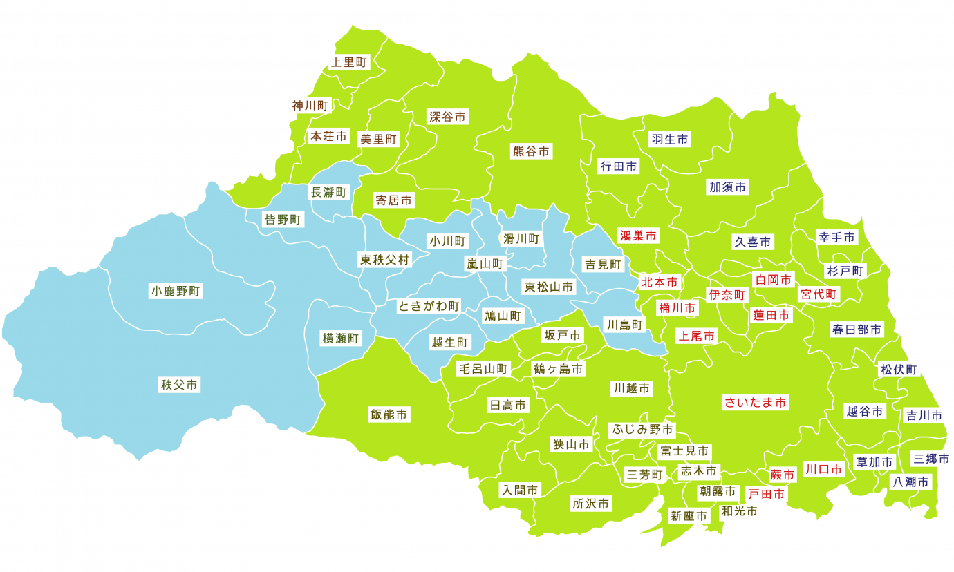 - 比企地域:東松山市、越生町、滑川町、嵐山町、小川町、川島町、吉見町、鳩山町、ときがわ町、東秩父村