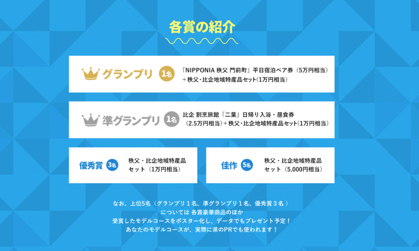 見事受賞された方には、豪華賞品をプレゼント! また、上位5つに選ばれたモデルコースはポスター化され、実際に県のPRに使用される予定です!