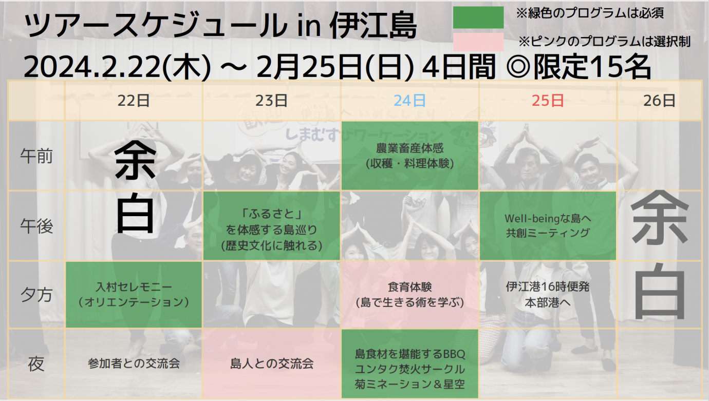 今回のツアーでは、上記の日程で伊江島の自然や食文化を味わい、地元住民との交流を通して「島人ライフ」を体験します。