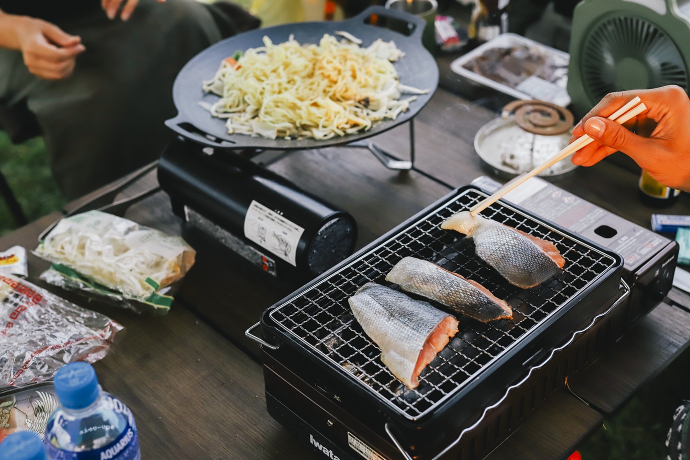 近くの鮮魚店で購入した鮭を使ったキャンプ飯も