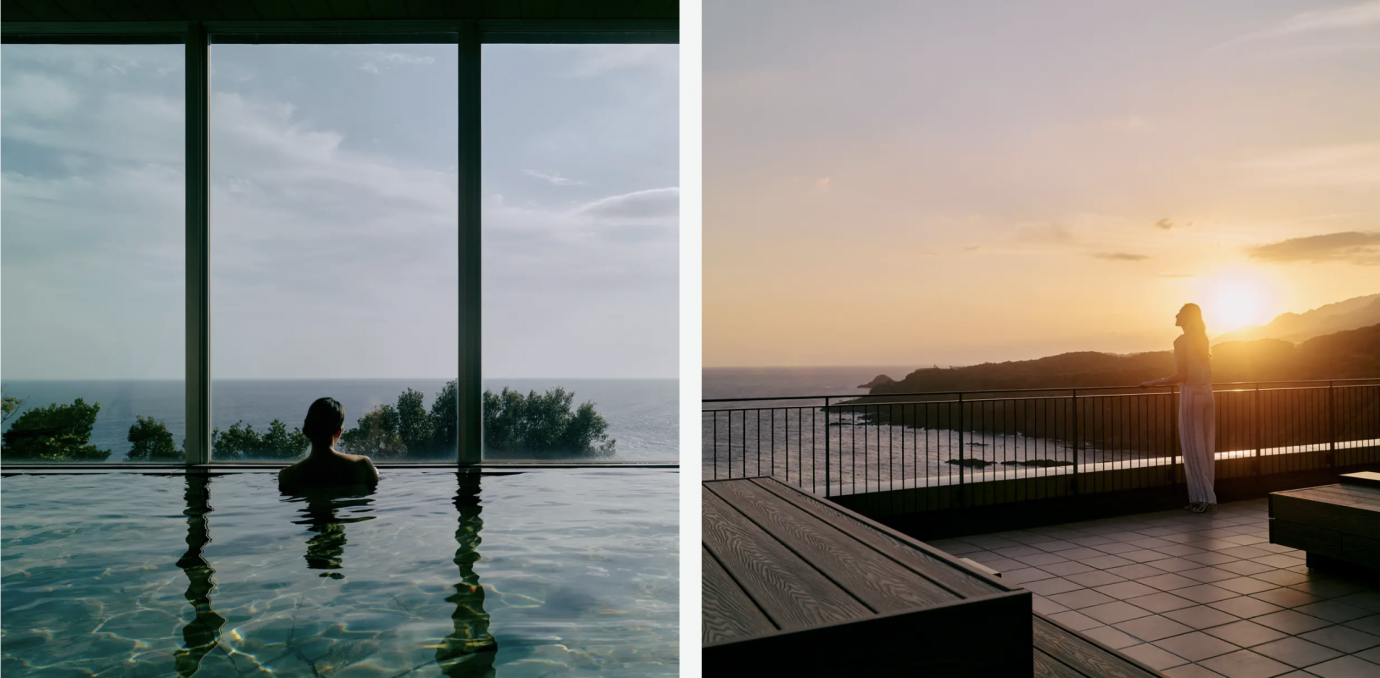 テラスではお酒をのみながら海に沈む夕日を眺めたり満点の星空を眺めたりすることができ、雄大な自然をひとり占めしているかのような気分を味わえます。大浴場は地下800メートルから湧き出る源泉かけ流し天然温泉で、スタッフも出勤日には温泉に入れますよ!