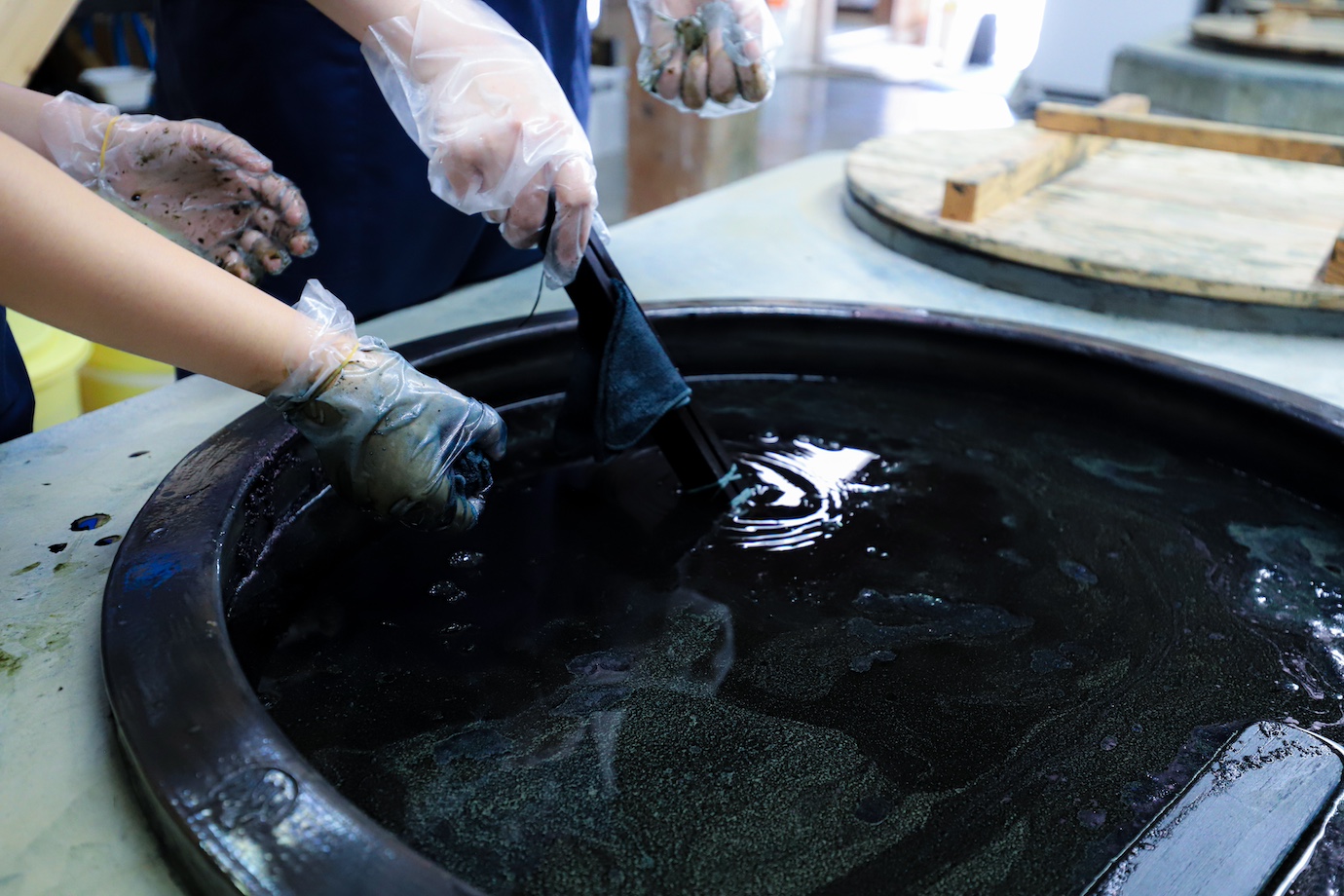 阿波藍染の世界で「本藍染」と言われる伝統の染色法「灰汁発酵立て」は、化学薬品を一切使わず、酸化・還元反応を起こすもの。徳島の染師は、江戸時代からつづくこの伝統的な方法を用いて、絹や綿でできた布地を鮮やかな藍色に染め上げます。