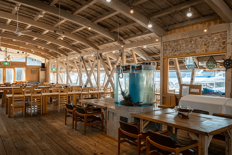 船着場に面した開放感たっぷりのレストランでは、日本有数の漁場で獲れた新鮮な海の幸を提供しています。