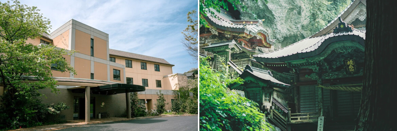 (左)外観 (右)本殿が岩の中にある荘厳な雰囲気の焼火神社