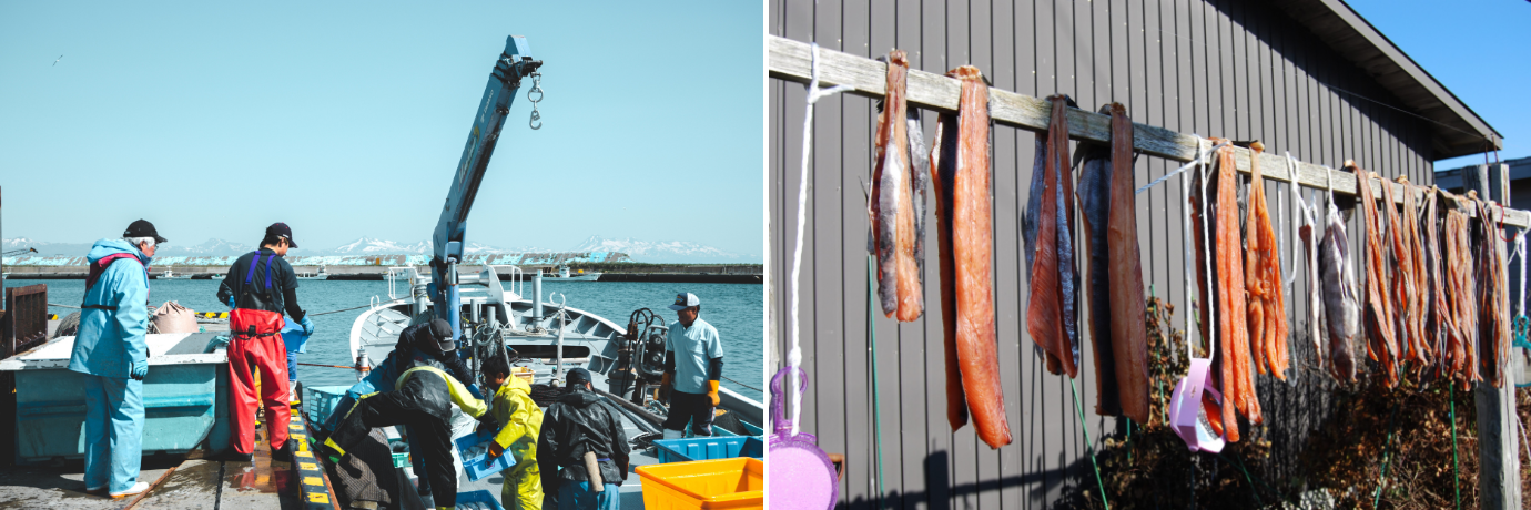 日本有数の鮭の産地として知られ、過去には秋鮭の水揚げ量が日本一に。鮭とばを干す風景や鮭漁の荷揚げの様子など、鮭と共にある標津町ならではの暮らしが現代にも脈々と受け継がれています。