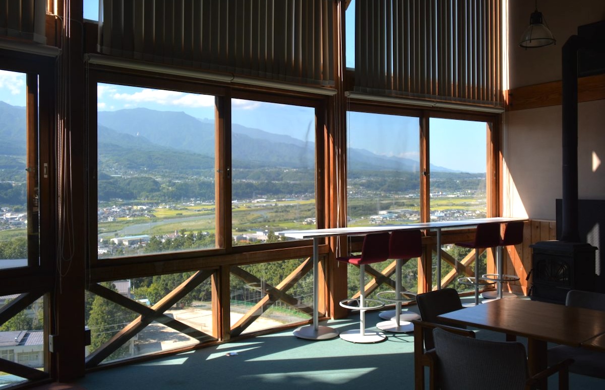 河岸段丘に立つ『だんきゅうハウス(とよテラス)』は、中央アルプスの絶景を楽しめる宿。木のぬくもりを感じる空間のなか、宿泊はもちろんイベントやコワーキングスペースとしても利用できます。
