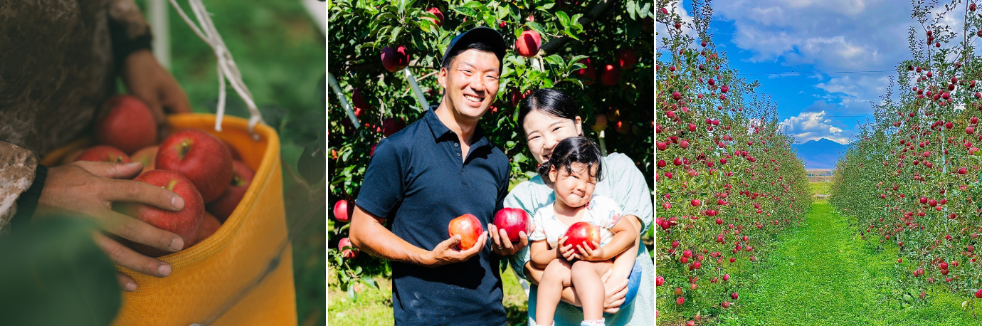 鮮やかな赤い果実が木々いっぱいに実ったりんご畑に立つと、秋の信州らしい風景が広がります。作業の合間には、獲れたてのりんごを丸かじりできるかも?
