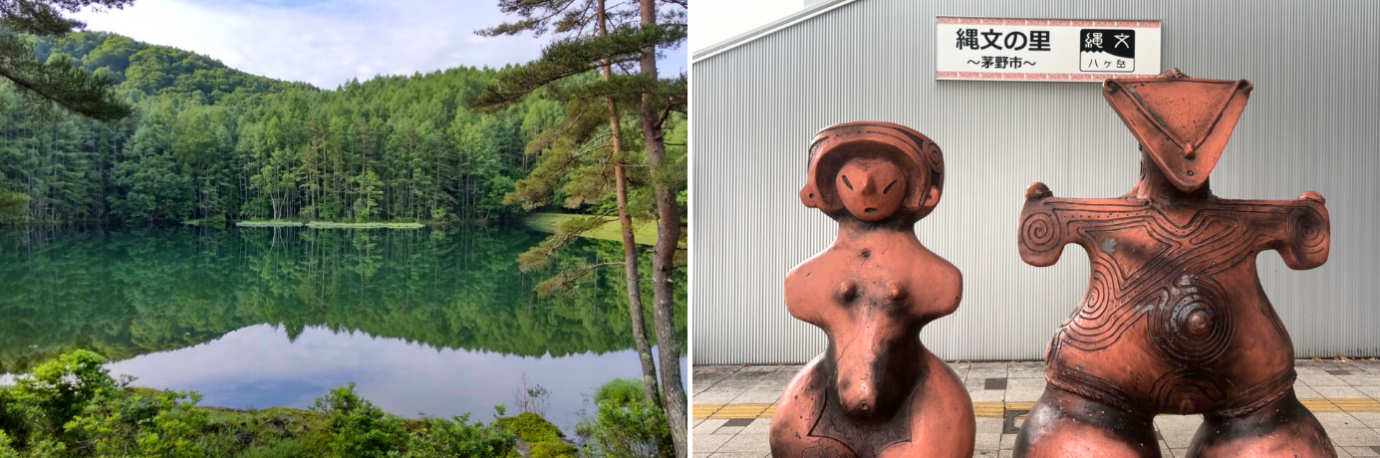 (左)御射鹿池 (右)茅野市は国宝の土偶が出土した縄文文化ゆかりの地