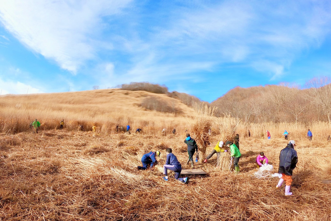 ※初日と最終日は移動日。期間中に交流会あり - 内容:茅葺屋根の材料となる茅の刈り取り作業(鎌を使った手作業)、束ね作業(状況による)