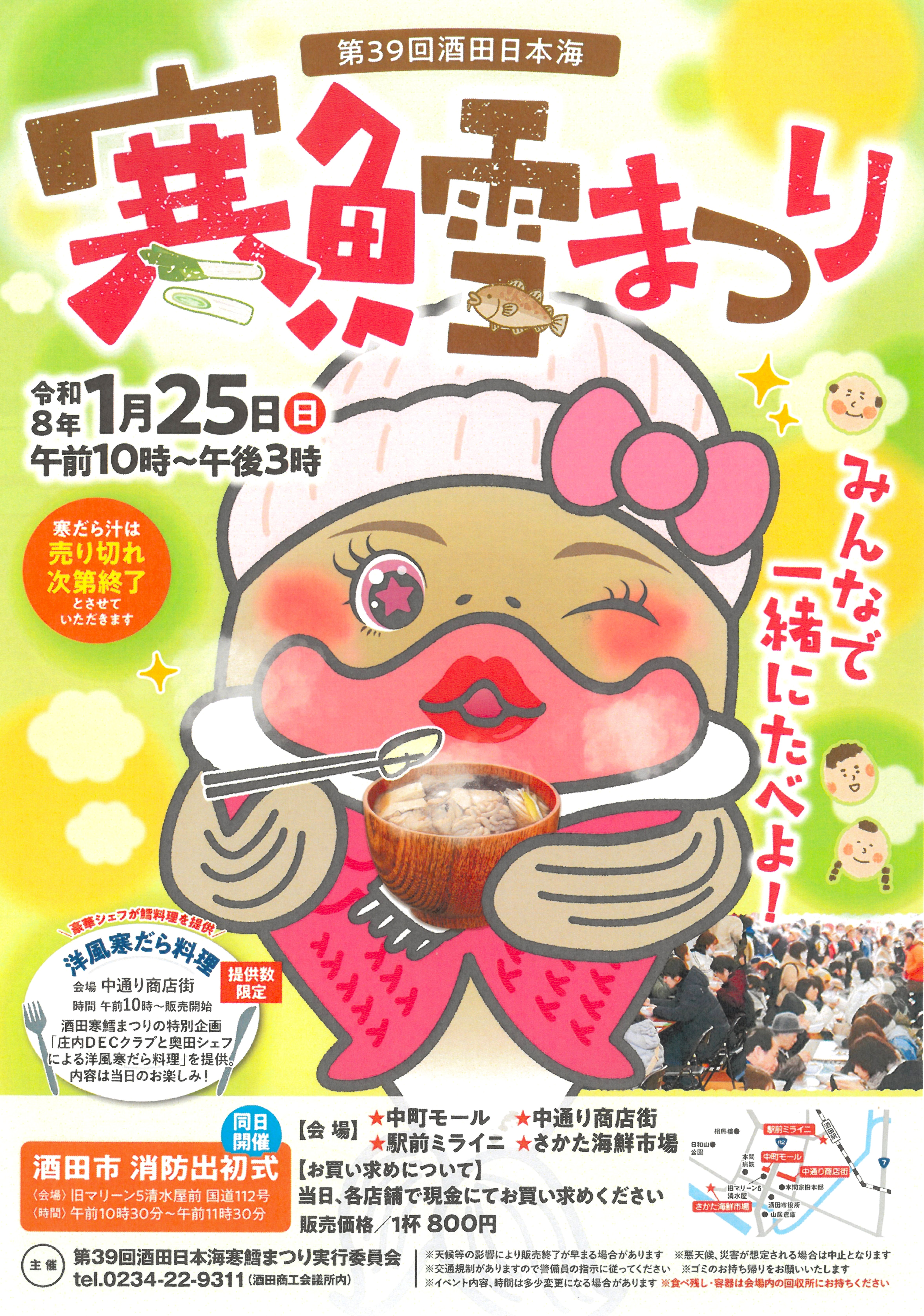 酒田市の寒鱈まつりは、日本海の冬の味覚「タラ」を味噌仕立てで仕上げた「寒鱈汁」を思う存分楽しむイベントです。