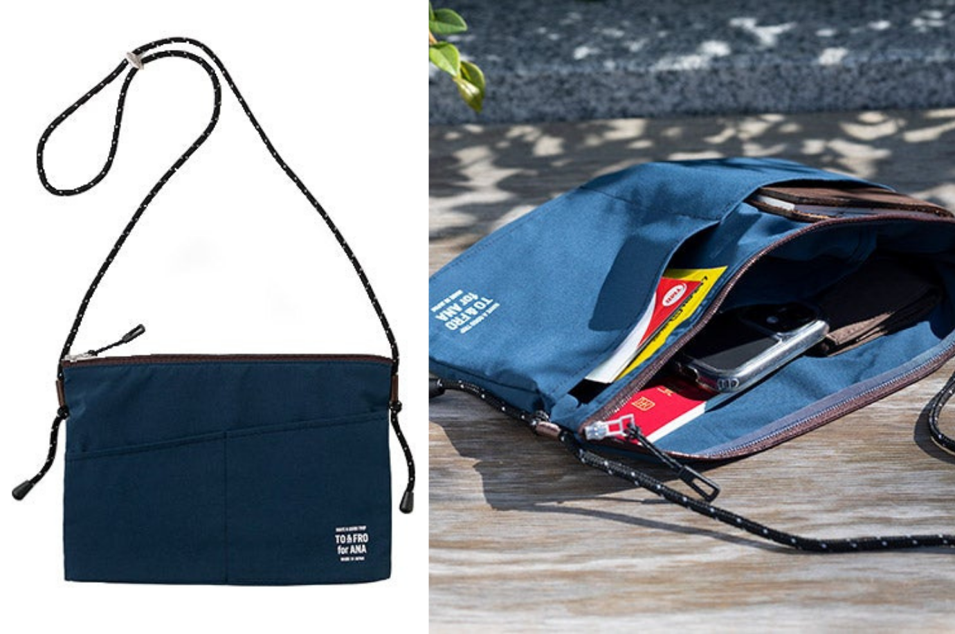 ANA と TO&FRO のコラボレーションライン。ANAオリジナルプリントが入ったパッカブル仕様のシンプルなコンパクトサコッシュが登場しました。撥水機能のあるKITE(トンビ)生地を使用し、柔らかいタッチなのにハリがあって高強度。底に隠しマチもあるので、しっかりと収納できます。